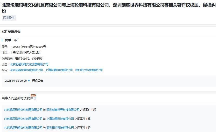 但泡泡玛特认为其存在侵权问题。天眼查App显示,近日,北京泡泡玛特文化创意有限公司以著作权权属、侵权纠纷为由,起诉了深圳拓竹科技有限公司、上海轮廓科技有限公司、深圳创客世界科技有限公司,案件由上海市浦东新区人民法院受理。