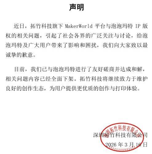 【大河财立方消息】3月16日,拓竹科技发布声明称,针对旗下MakerWorld平台与泡泡玛特IP版权相关问题,已与泡泡玛特进行了友好磋商并达成和解,相关问题内容已经全面下架。同时,拓竹科技针对上述事件引起的社会各界的讨论与关注,向泡泡玛特及广大用户致歉。
