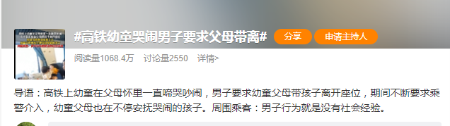 今年的2月26日,#高铁幼童哭闹男子要求父母带离#话题一度登上微博热搜,引发网友热议。