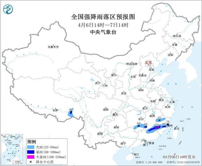 r预计,4月6日14时至7日14时,西藏东南部、湖南南部、江西南部、福建西北部和中南部、广东北部等地部分地区有大到暴雨,其中,福建西南部等地局地有大暴雨(100~120毫米);上述部分地区伴有短时强降水(最大小时降雨量20~40毫米,局地可超过50毫米),局地有雷暴大风等强对流天气。